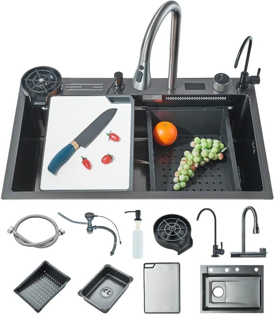 Évier à Cascade Numérique, Évier De Cuisine Cascade, Evier Cuisine Multifonction, Lavabo Cuisine, Éviers De Cuisine En Acier Inoxydable 304 Avec Robinetterie Extractible (noir, 80 × 45 × 22 cm)